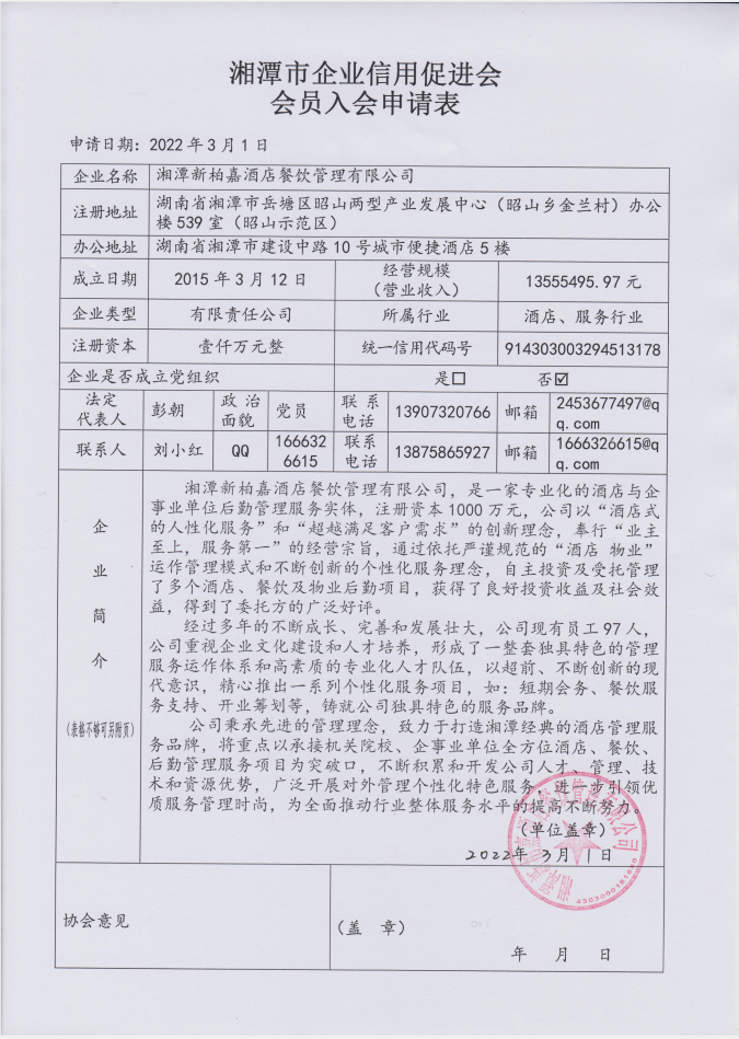 | 名稱(chēng): 湘潭新柏嘉酒店餐飲管理有限公司 | 登記證號(hào): 914303003294513178 | 法定代表人: 彭朝 | |||||||||||||||